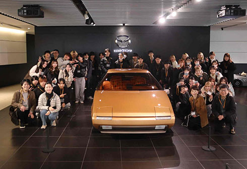 マツダ本社ロビーにて。往年のコンセプトカー「MX-81」を囲み、合同ゼミの全員で記念撮影