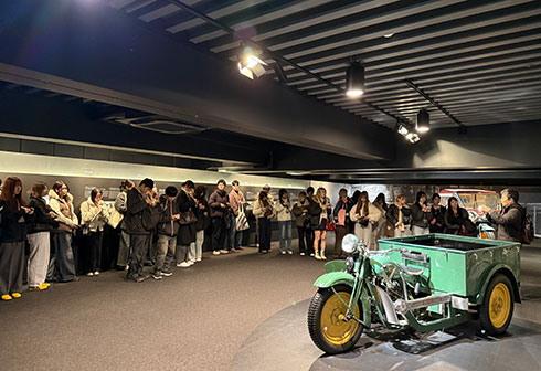12月6日、商学部の合同ゼミナールで、マツダ株式会社(広島県安芸郡府中町。以下、マツダ)内の展示施設「マツダミュージアム」を見学しました。参加したのは、経営学科で企業の社会的責任を中心に学ぶ世良ゼミナール(以下、ゼミ)、商学科でマーケティングを学ぶ徐ゼミと厳ゼミ、3つのゼミの2年生約50名です。日頃学んでいる経営学の知識を思い起こしながら、現場でさまざまな事例に学ぶ、貴重な機会となりました。