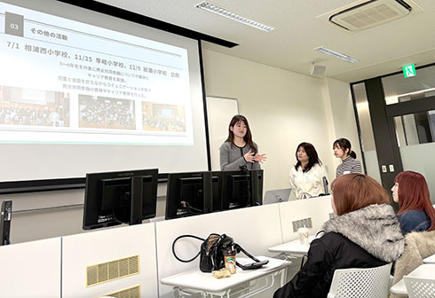 津久井ゼミの4名からは、「インテリア業界のマーケティング戦略」、「シビック・プライド※1の醸成」、「精神障がい者雇用の職場定着」、「企業によるカスタマーハラスメント対策の実態」など、多彩な卒論への取り組みについてあらためてSDGsという、より広い文脈から捉え直して報告がされました。