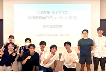 9月24日、経済科学部による開講科目「特殊講義b(ITソリューション実践)」の実習成果発表会を行いました。この科目は3年生9名が履修し、株式会社ひろぎんホールディングス・株式会社NTTデータ中国・広島県庁による産学官連携教育プログラム「広島の魅力再発見~IT・デジタル技術を活用したビジネスモデル検討~」に7名、TOPPANデジタル株式会社(広島サテライトオフィス)主催の「デジタルを活用した地域課題へのアプローチ」に2名が参加し、それぞれ本学の学生と他大学の学生がグループを組んで、IT・デジタルの知識やスキルを生かした地域課題解決の企画を立案しました。