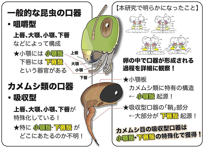 - カメムシ目昆虫を特徴づける吸収型口器 (刺し口) の主要部分である「鞘」状構造が下唇の端肢節から形成される様子を連続的に観察し、下唇鬚との相同性を形態学的に明らかにした