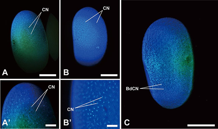 図1.コオイムシの胚発生 (ステージ2-3:卵割-胚盤葉形成).細胞核を特異的に染色し、蛍光顕微鏡で観察した.卵割核が卵表へ到達し、胚盤葉を形成する様子が観察された. BdC:胚盤葉細胞の核,CN:卵割核. スケールバー:A,B,C = 500 μm,A’ = 200 μm,B’ = 100 μm.