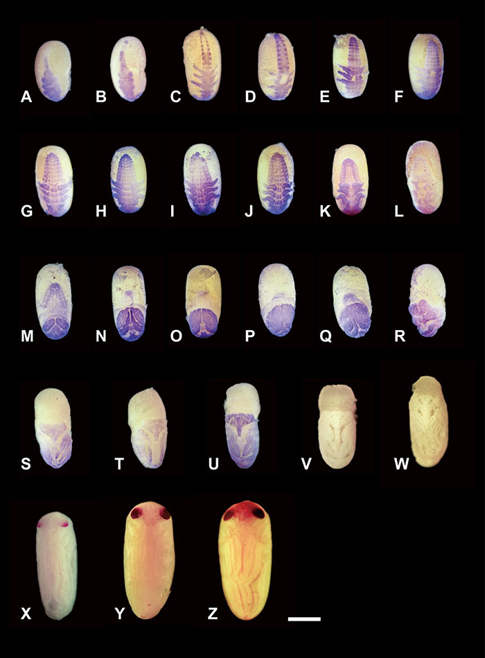 図2.コオイムシの胚発生過程 (胚帯形成から孵化まで).胚の観察の際には、卵殻をピンセットで取り除いた.ステージ4–7 (A–U) の胚は、細胞核を特異的に染色する試薬で染色して観察した.ステージ8–10 (V–Z) の胚は染色せずに観察した.胚は実体顕微鏡下で撮影した.スケールバー = 500 μm.