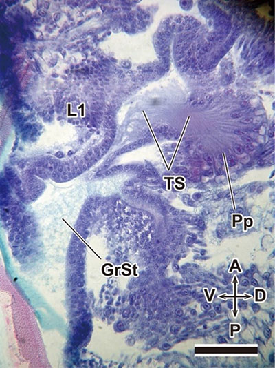 図3.コオイムシの胚発生ステージ8における側脚 pleuropodium の縦断面.スケールバー = 50 μm. GrSt:顆粒状構造、L1:前胸脚、Pp:側脚、TS:糸状構造.