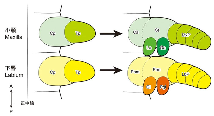 図5. 一般的な昆虫における小顎および下唇の形成過程.一般的な昆虫類における小顎および下唇の形成過程では、それぞれの原基が端肢節 (Tp: telopodite) および基肢節 (Cp: coxopodite) に分節化した後、端肢節はそれぞれ小顎鬚 (MxP: maxillary palp) および下唇鬚 (LbP: labial palp) となる. 基肢節は小顎では基節(蝶咬節, St: stipes) および亜基節(軸節, Ca: cardo) に分節化した後、蝶咬節から内葉 (La: lacinia) および外葉 (Ga: galea) が分化し、下唇では基節 (前基節, Prm: prementum) および亜基節 (後基節, Pom: postmentum) に分節化した後、前基節から中舌 (Gl: glossa) および側舌 (Pgl: paraglossa) が分化する.