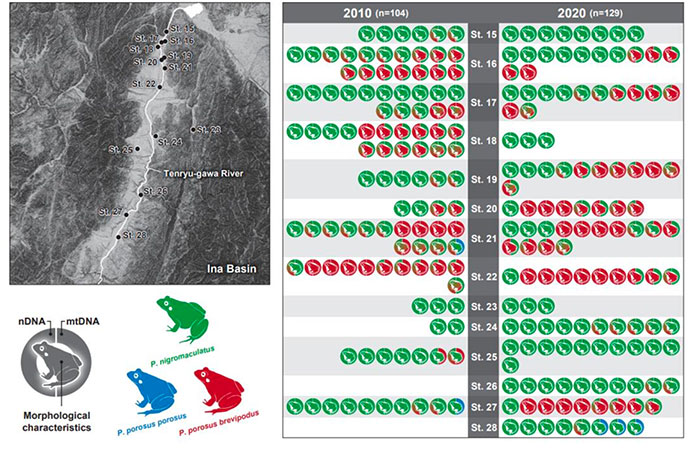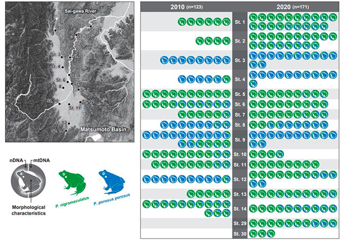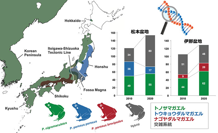 松本盆地では、トノサマガエルとトウキョウダルマガエルそれぞれの純系個体の割合が減少し、交雑個体が増加する傾向が確認された。また、2010 年の調査研究時にはトノサマガエル純系やトウキョウダルマガエル純系だけで構成されていた個体群についても、2020 年には種間交雑系統が含まれるように変化していた。