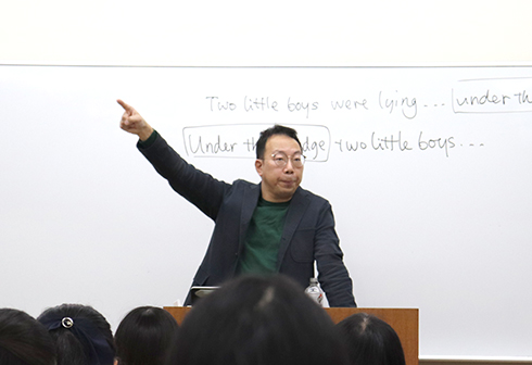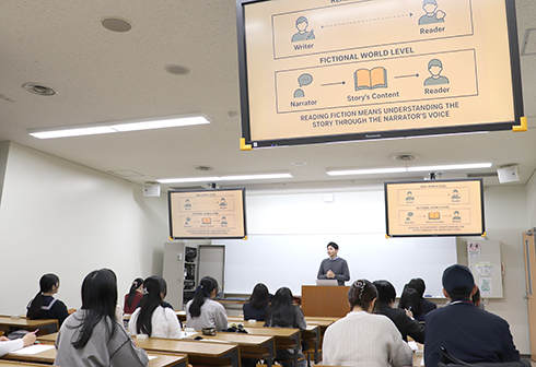本学の西光希翔准教授による「語っているのはどんな人?英語から見えてくる語り手の姿」では、小説を題材に語り手について考えました。小説によっては同じ小説にもかかわらず章によって文章の難易度が異なることもあり、参加者は実際の文章を読んで感じたことを積極的に発表していました。杏林大学教授の倉林秀男教授による招待講演「小さな疑問で始まる楽しい英語の世界」では、名詞句の単数形と複数形について考えることから始まり、実際の小説や曲を題材に、様々な複数形について考えてみる活動が行われました。ことばは「伝えたいこと」を伝える道具であり、文字や音で表されていない話し手・書き手の「気持ち」を受け止め正しく理解することの重要性を指摘されていたのが印象的でした。