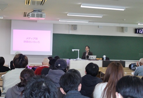 12月10日、人文学部英語英文学科は、京都外国語大学名誉教授であり、『ウィズダム英和辞典』(三省堂)の編者でもある赤野一郎先生をお招きし、2025年度学術講演会「語彙力と辞書力を鍛える — 表現力の向上を目指して —」を開催しました。英語英文学科の学生を中心に、教職課程履修者や英語教育に関心をもつ学生・教職員、学外の参加者など、およそ70名が聴講しました。
