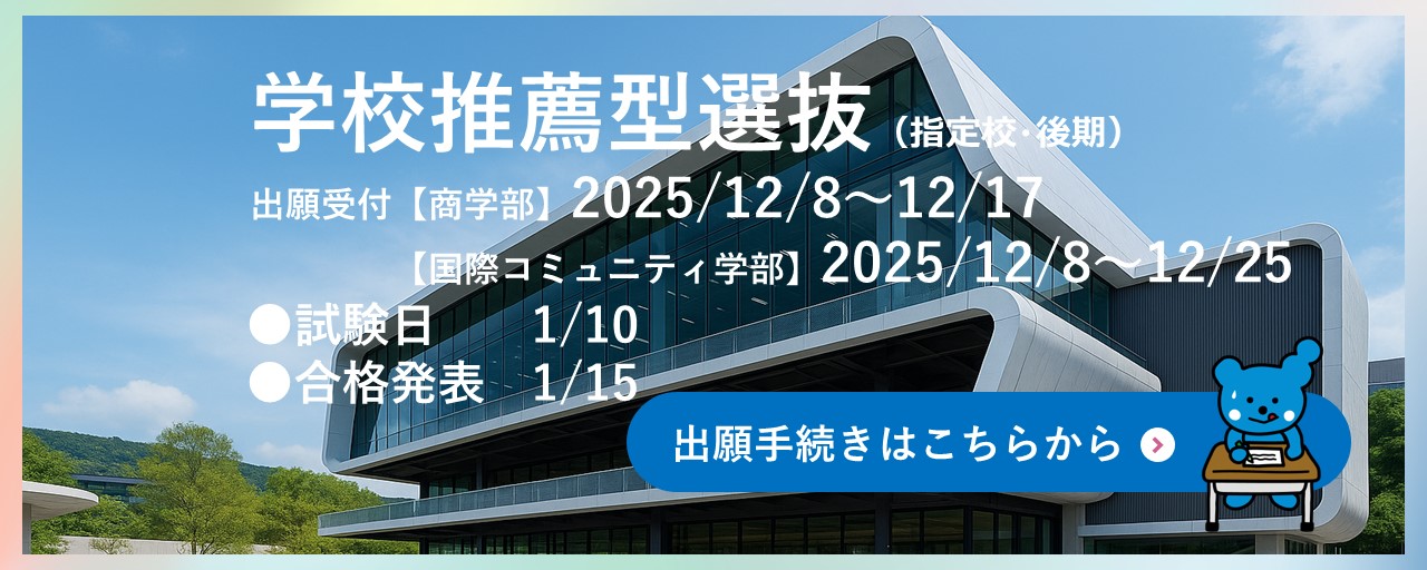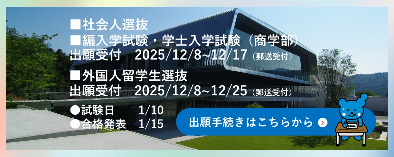 重要なお知らせ 2025/06/12 「広島修道大学 入学試験要項2026」の訂正について 2025/07/18 新型コロナウイルス感染症に関する本学の2026年度入試の対応について 2025/07/22 令和8年度大学入学共通テスト 成績請求チケットについて 2025/08/29 出願書類の訂正について PICK UP TOPICS NEWS 2025/12/18 【一般選抜】周南市試験場臨時バス運行のお知らせ お知らせ 入試情報 一般選抜 2025/12/08 【WEB入試直前対策講座】特設ページの公開を開始しました お知らせ イベント情報 WEB入試直前対策講座 2025/12/08 学校推薦型選抜(指定校)、外国人留学生選抜、社会人選抜、編入学・学士入試の出願受付を開始しました お知らせ 入試情報 2025/12/03 農学部(仮称)【2027年4月開設予定】2027年度入学者選抜の概要について お知らせ 入試情報 農学部(仮称) 2025/12/01 【WEB入試直前対策講座】エントリー受付を開始しました! お知らせ イベント情報 WEB入試直前対策講座 2025/11/26 【学校推薦型選抜】受験生のみなさんへ お知らせ 入試情報 学校推薦型選抜 一覧を見る RSS ADMISSION 入試について 入試情報 インターネット出願 入学手続、入学式、ガイダンス等のご案内 COURSE 学部・研究科 商学部 人文学部 法学部 経済科学部 人間環境学部 健康科学部 国際コミュニティ学部 研究科 VOICE 卒業生の声 在学生の声 研究者の声 ABOUT SHUDO 修大を知る SHUDO×授業紹介動画 数字で見る修大 修大キャンパスツアー動画 学費・奨学金 修大パンフレット 動画で見る修大 入学センター LINE公式アカウントのご案内 夢ナビ 広島修道大学専用ページのご案内 広島修道大学公式WEBサイト