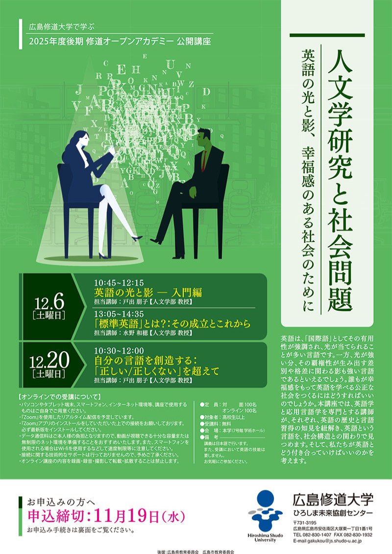 広島修道大学では、生涯を通じた学びに対応するため、高校生以上の一般市民の方に向けて「修道オープンアカデミー」を開講しています。高校生以上を対象とした無料の「公開講座」として、「人文学研究と社会問題:英語の光と影、幸福感のある社会のために」を開催します。