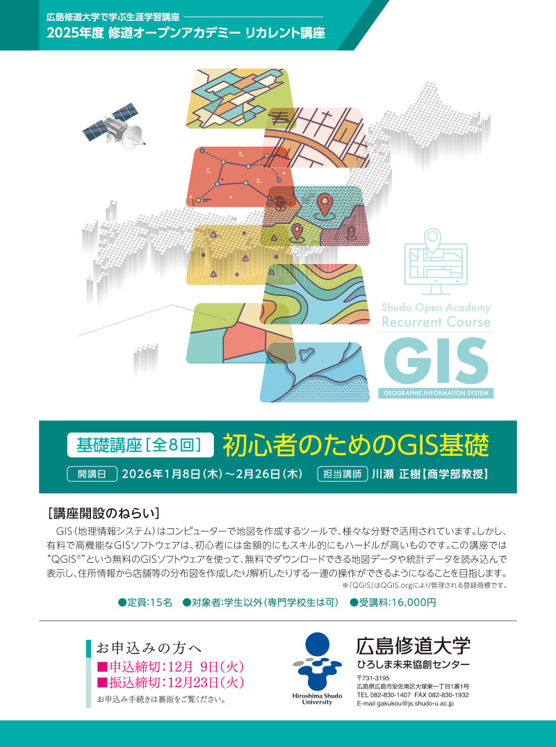 広島修道大学では、生涯を通じた学びに対応するため、高校生以上の一般市民の方に向けて「修道オープンアカデミー」を開講しています。この度、人生100年時代やデジタル社会の進展、絶え間なく変化する社会情勢を踏まえ、社会人の学び直しとして「修道オープンアカデミー リカレント講座」を開催します。