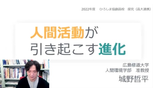 第5回目の講義は、「人間環境が引き起こす進化」をテーマにした人間環境学部の城野哲平准教授の講義です。残念ながら、対面ではなく講義動画の視聴となりました。