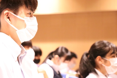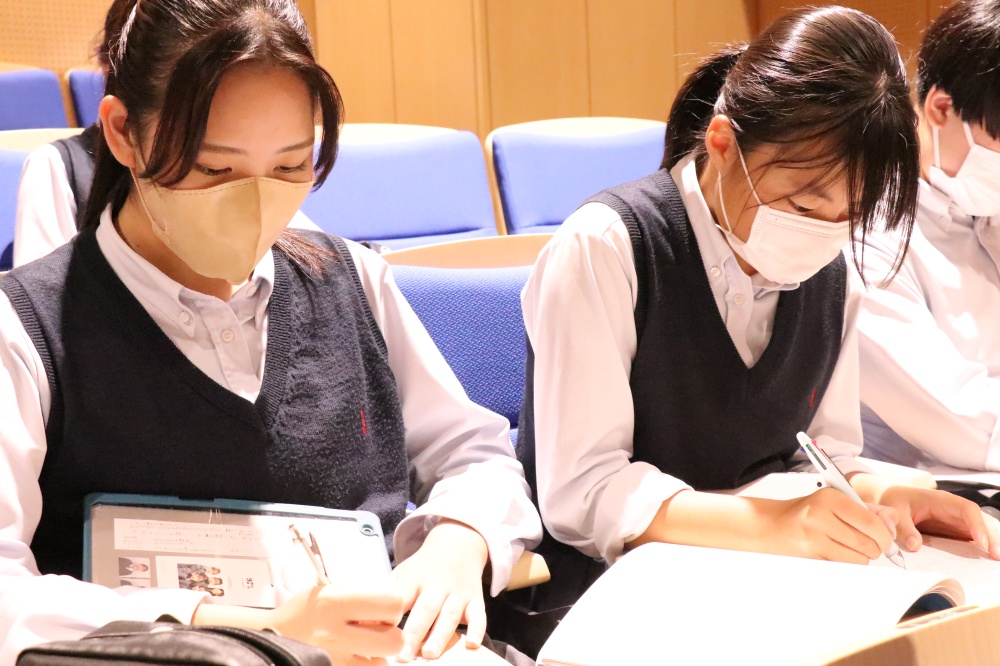 コミュニケーションをとるうえで、他者の行動の背景にある価値観や思考を理解することが不可欠なのですが、生徒たちへの課題として、まずは自分の行動の背景にある価値観に目を向けることが提示されました。事後学習で、生徒たちは「自分が無意識にとっている行動とその背後にある価値観は何か」を考えていきます。無意識に目を向けるという、なかなか難しい課題ですが、日頃の行動を振り返り、文章にして書き出し、グループで共有し、自分たちの価値観について考えていきます。