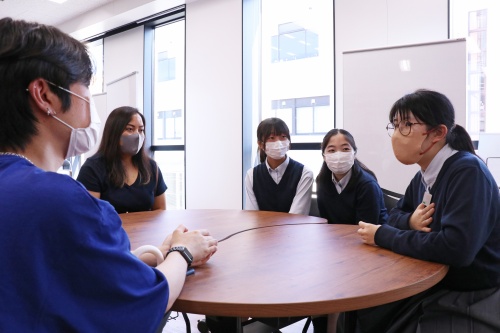 前半は留学生と参加希望生徒との交流です。いくつかのグループに分かれて交流を楽しみました。中学1年生から高校3年生まで幅広い範囲の生徒が参加しており、話題も様々でした。留学した理由や広島修道大学で何を学んでいるか、好きな食べ物やアニメ……。あっという間に1時間が経過していました。生徒は、「なかなかこのように自由に留学生と会話できる機会は少ないから、とても楽しかった」と話していました。