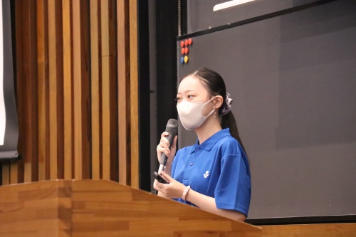 流通や第二言語習得、リーガルマインドなど、生徒たちが日頃あまり聞き慣れない言葉も出てきました。生徒たちは配布していただいた資料や修学フォリオにメモを取りながら説明を聞いていました。プログラムの中には、本校卒業生で広島修道大学に進学した先輩が大学生活について紹介する時間もありました。高校生活との違いや、大学進学に向けて頑張ったことなどを発表してくれ、生徒たちは先輩たちからのメッセージに真剣に耳を傾けていました。