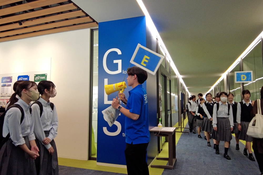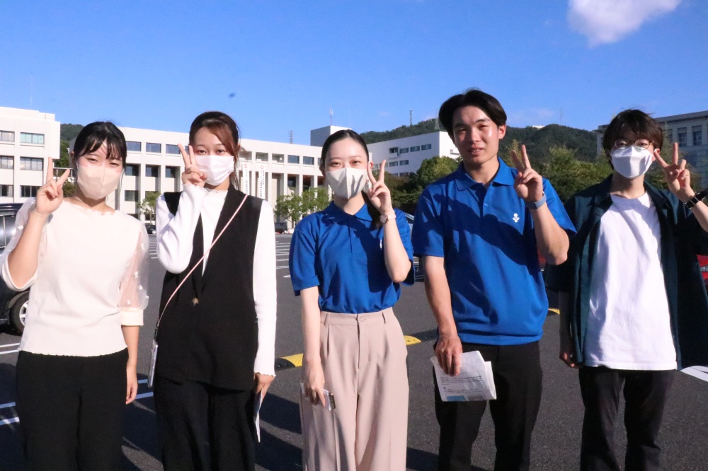 学部紹介と先輩からの大学紹介のあとは、キャンパスツアーで、広島修道大学の学生さん達が施設を紹介しながら大学内の見学に連れて行ってくれました。高校とは違い、学部ごとに異なる研究棟の造りや食堂の多さに驚いていました。
