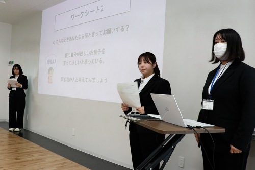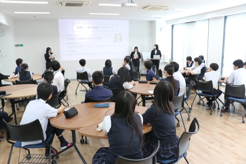 今回は中学3年生を対象にアサーショントレーニングを行いました。これは自分と相手を尊重しながら、自分の意見や気持ちを率直かつ適切に伝えることができるようになるためのトレーニングで「上手に頼みごとをしよう!」というテーマで生徒はそれぞれ「上手な頼み方」を考えて発表しました。
