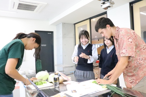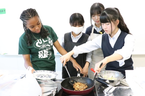 野菜や肉を切ったり、そのほかの材料を準備したりする方法を英語で伝えることは難しく、部員たちは伝えることに苦労していましたが、伝えようとする気持ちが伝わり、お互いに楽しみながら調理に臨んでいました。