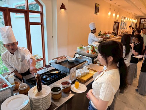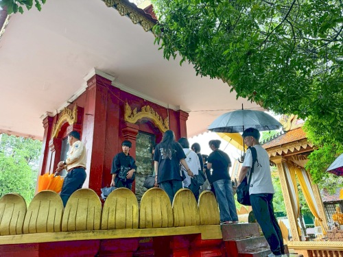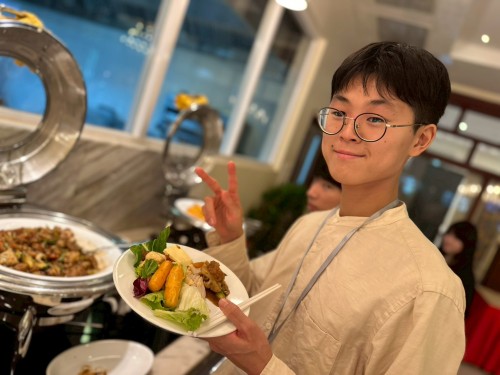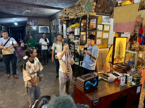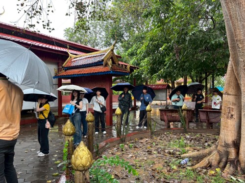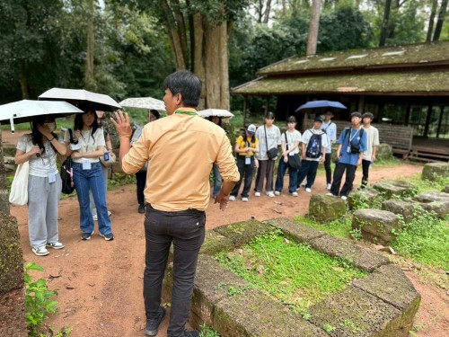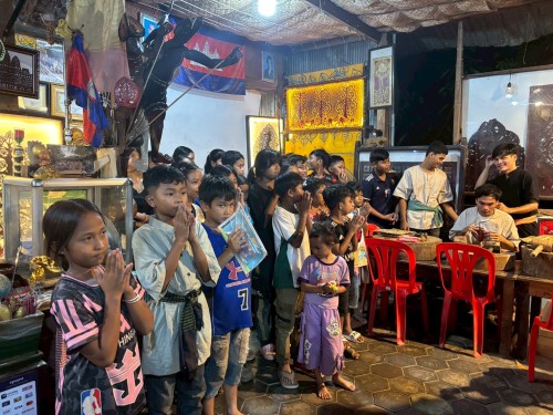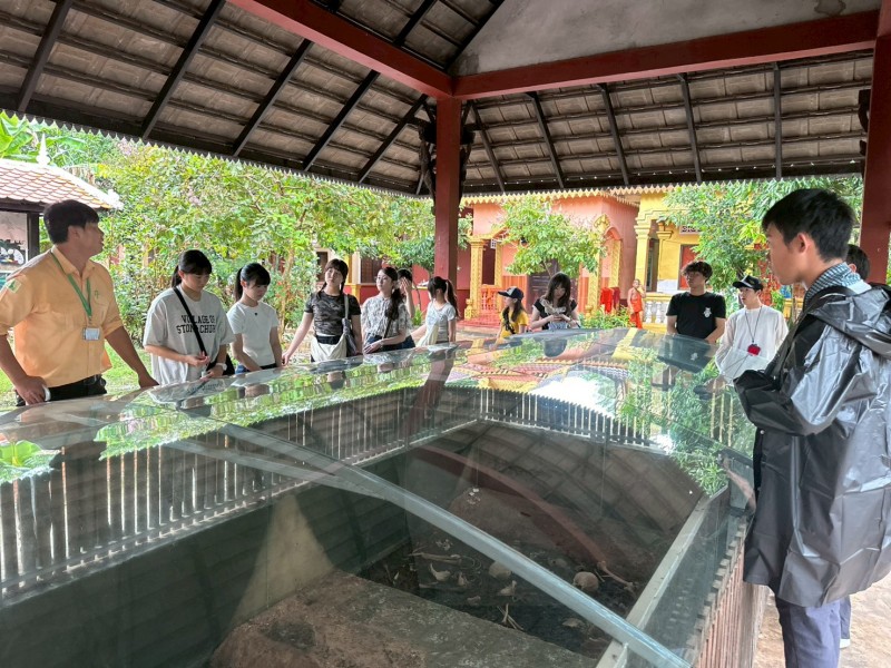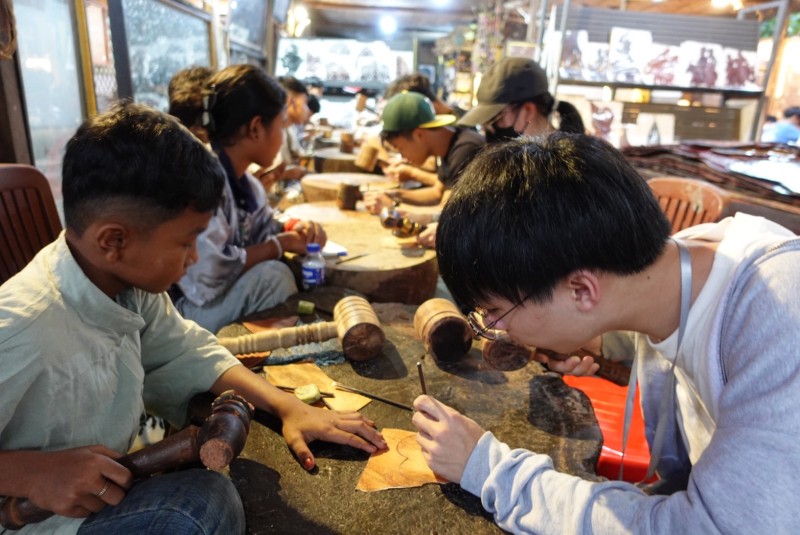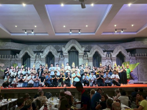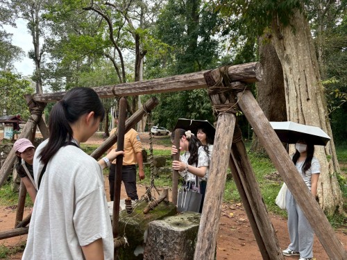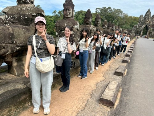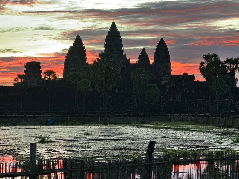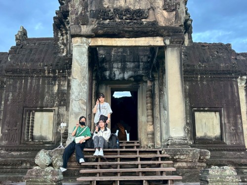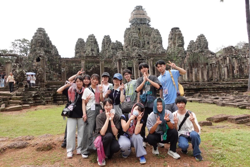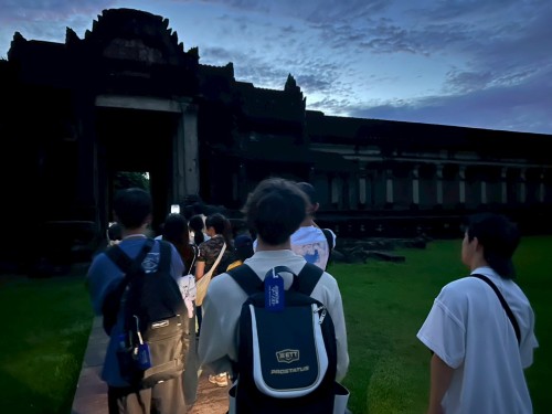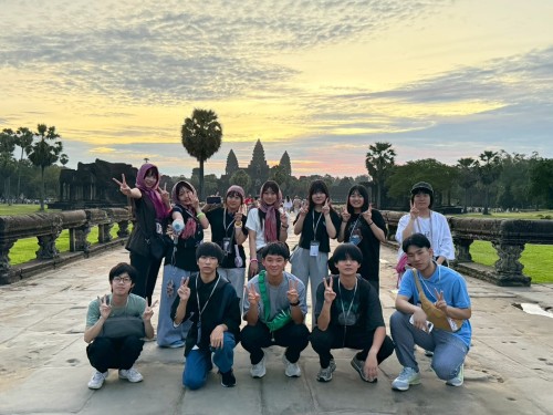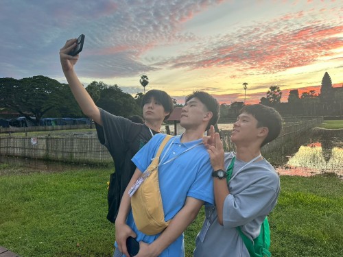 カンボジア研修3日目の朝、まだ暗いうちにホテルを出発し、世界遺産アンコールワットへ向かいました。空には星が残る中、多くの観光客が朝日を待っていました。やがて、東の空が少しずつ赤く染まり、アンコールワットの塔の後ろから太陽の光が顔を出す瞬間、思わず息をのむほど美しい光景が広がりました。生徒たちは写真では伝えきれない迫力と神秘さを肌で感じ、改めて歴史の重みや自然の美しさを実感しました。早起きは大変でしたが、一生の思い出になる貴重な体験となりました。「来てよかった」と心から思える、一生の思い出になる体験になりました。