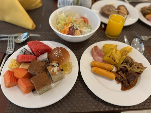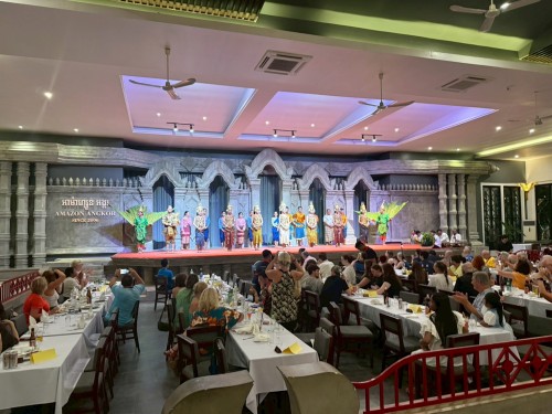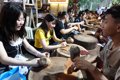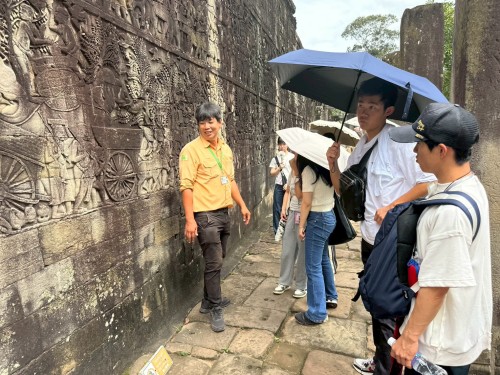 アンコール・ワットの日の出ツアーのあとは、小休憩を挟んで、午前はアンコール・トム遺跡群へ観光訪問をしました。 遺跡群は現在、一部が修復中でしたが、建造物に描かれている壁画を見たり、その説明を受けたりしながら、カンボジアの過去の姿であるクメール王朝について学ぶことができました。