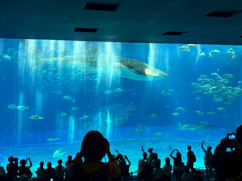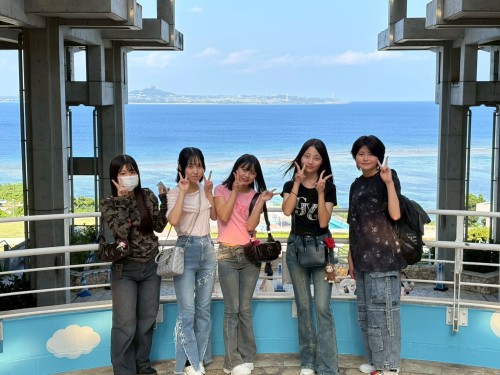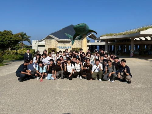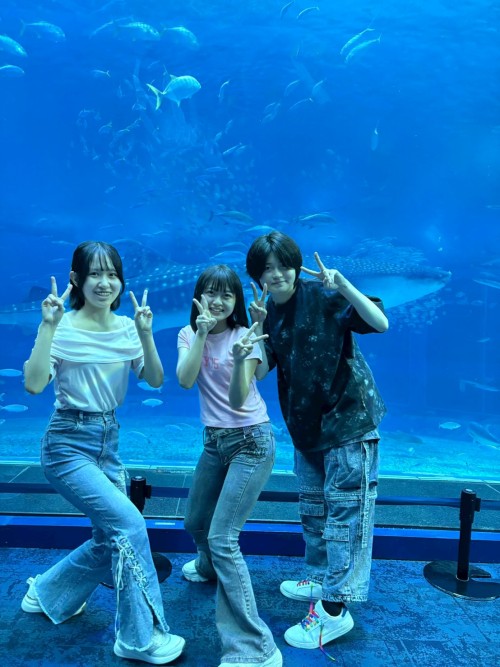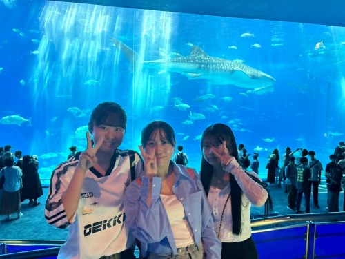 美ら海水族館では、なんと言っても巨大なジンベエザメに生徒達の目は釘付けでした。多くの生徒がジンベエザメや魚達と写真を撮ったり、お土産を買ったりして、楽しい時間を過ごしました。