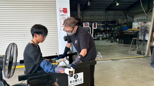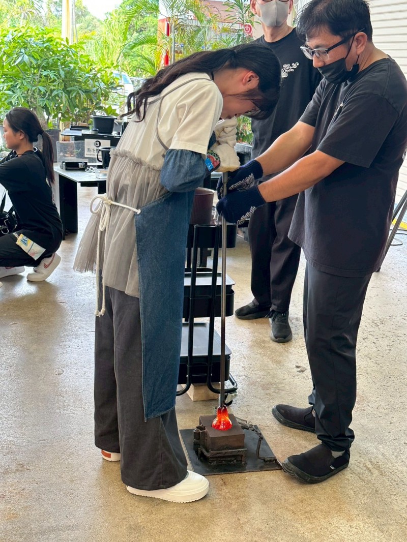 琉球グラス体験では、琉球グラスの歴史を教えてもらい、実際にグラス作りを体験しました。グラスを作るのは非常に難しく、グラス職人の技術の高さに驚いていました。