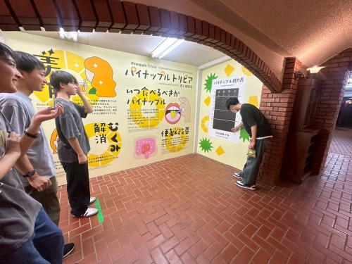 グラス体験が終わった後はパイナップルパークへ移動し、沖縄の特産品でもあるパイナップルについて学び、実際にパイナップルが作られている様子を見たり、食べたりして、楽しみました。