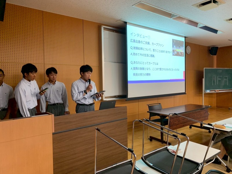 「広島の原爆」と「沖縄の地上戦」を比較したり、大久野島の例から、広島を「戦争の加害者」として捉えたり、広島が誇る2つの世界遺産でインタビューをしてまとめたりしました。また、路面電車やお好み焼き、スポーツ(カープとサンフレッチェ)が戦後の復興に果たした役割について考察しました。