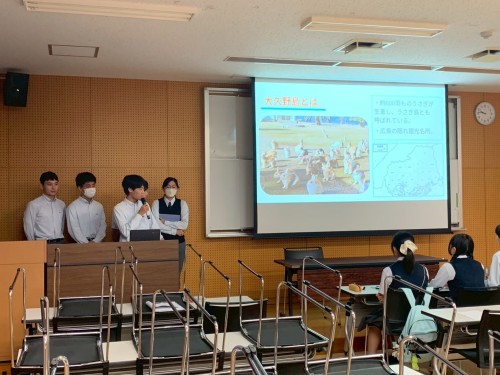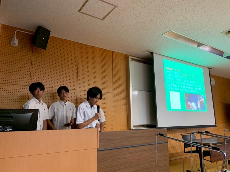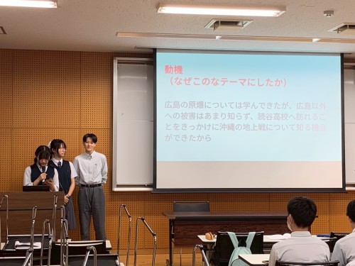 読谷高校との交流では、両校がこれまで取り組んできた平和学習について、お互いにプレゼンテーションを行いました。