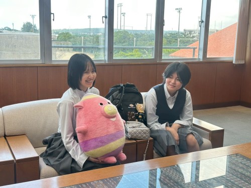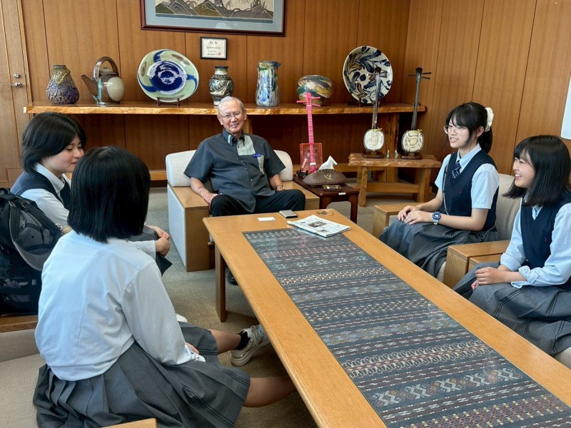 午後からは一部の生徒が読谷村役場へ赴き、昨年9月に行った「被爆ピアノ・平和集会」の際にビデオメッセージを寄せてくださった読谷村の村長・石嶺傳實様へ表敬訪問を行いました。