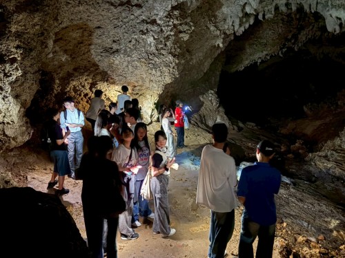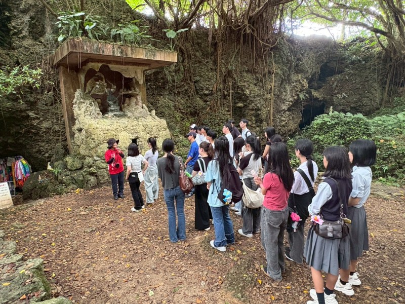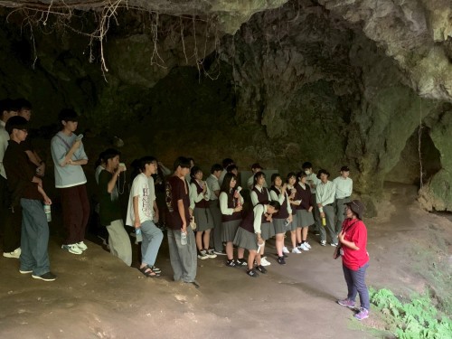 その他の生徒は1年生の平和学習で被爆ピアノの際に学んだ、シムクガマとチビチリガマへ実際に訪れました。本来、チビチリガマの中に入る事はできませんが、これまでの交流を通して、協創高校の生徒は特別に中に入る事を許可して頂きました。ガマの中は真っ暗で、今でも遺品や遺骨が残っており、当時の悲惨な状況を肌で感じる事ができました。ガイドさんの話しにも真剣に耳を傾けて、二度と戦争を繰り返してはいけないという想いをより強くすることができました。