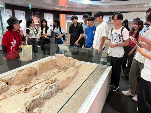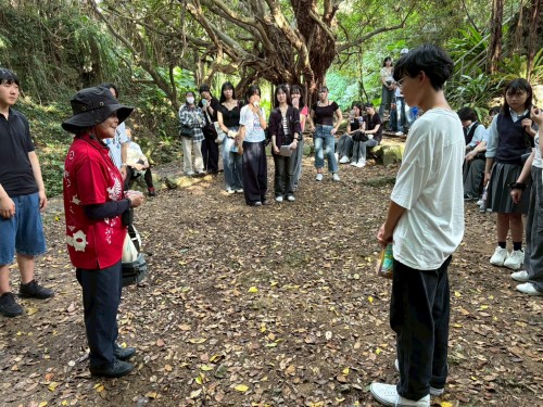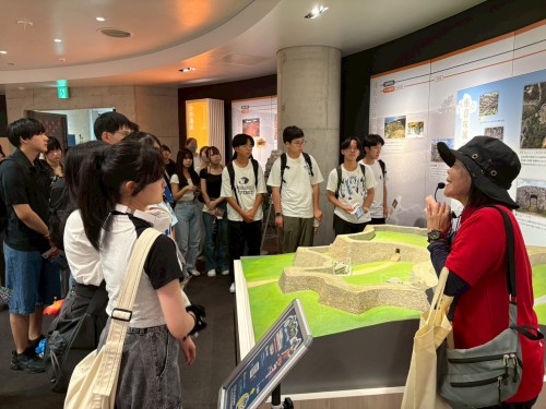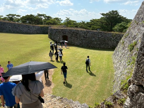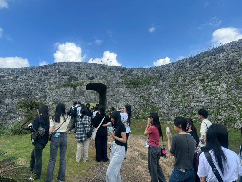 掩体壕・ユンタンザミュージアムのグループは読谷村の現地のガイドさんと合流し、ミュージアムや掩体壕の説明を行なって頂きました。ユンタンザミュージアムでは読谷村の歴史や、文化、遺産等の資料を見学し、読谷村について理解を深めました。また、座喜味城跡を見学し、琉球王国の歴史にも触れる事ができました。城壁の上からは読谷村や水平線を一望でき、生徒達はその壮大な景色に感動していました。