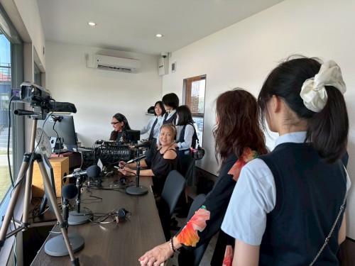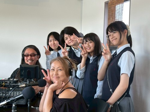 表敬訪問の後は、「被爆ピアノ講演会」で司会を務めていただいた金城礼子さん(FMよみたんパーソナリティ)の案内で、FMよみたんサテライトスタジオにお邪魔し、実際にラジオを収録する様子を間近で見学させていただきました。