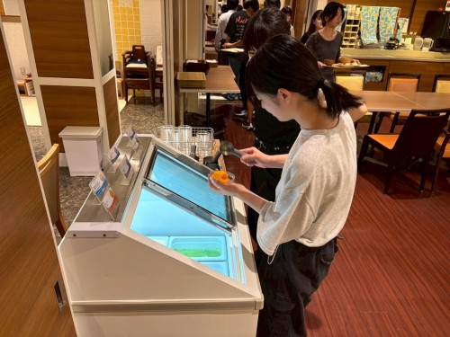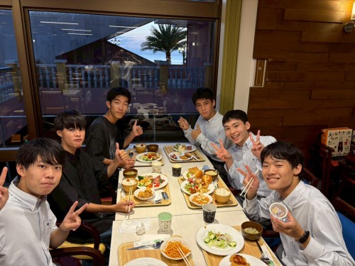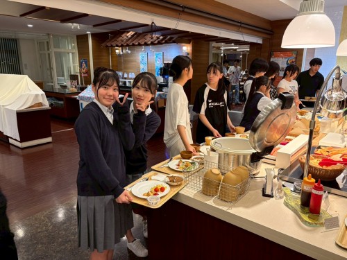 その後、ホテルに移動し夕食を食べました。夕食のビュッフェでは沖縄の伝統的な料理も数多くあり、中でもブルーシールのアイスクリームが大人気でした。暑い中、長い距離を歩いたこともあり、疲れも見えていましたが、夕食でエネルギーをチャージする事ができたようです。