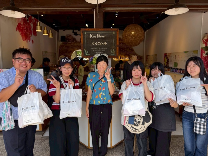 また、オールドマーケットでは、英語コミュニケーションⅡの授業で扱った単元に出てきた日本人女性、篠田ちひろさんが経営されている「クル・クメール」というハーブ製品を扱う店舗にも訪れ、偶然店舗にいらっしゃった篠田さんと生徒たちが笑顔と歓声を混じえながら交流する、素敵な出会いもありました。