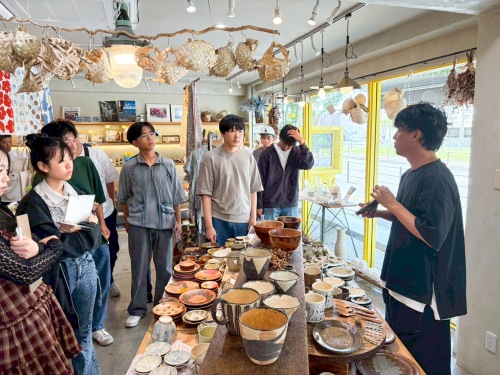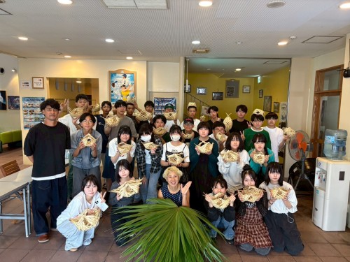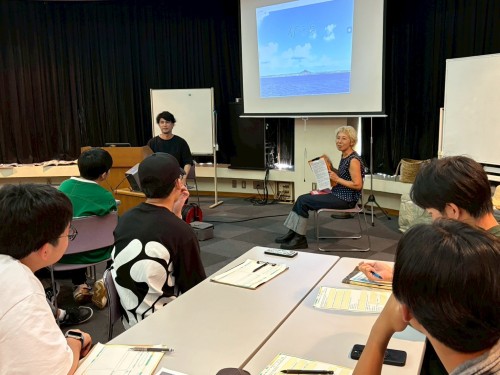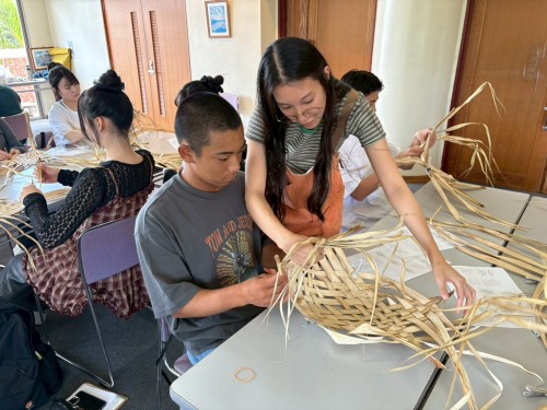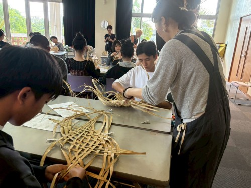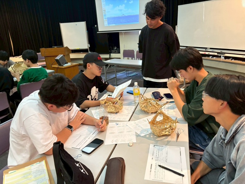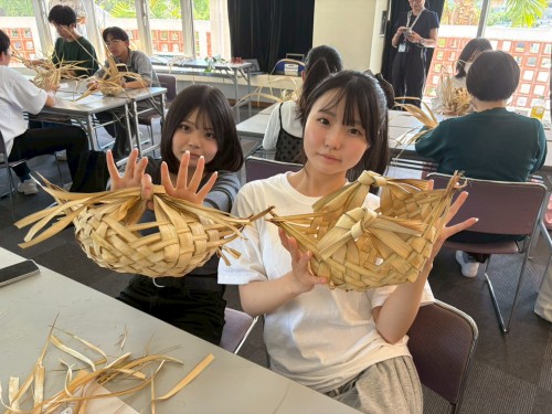 セソコマサユキさんのコースでは、ものづくりをテーマに活動を行いました。セソコさんは編集者、ライター、カメラマンと様々な顔を持ち、現在は「島の装い」というお店の経営をしており、沖縄県内でものづくりをされている多くの作家さんの作品を販売しています。そんなセソコさんからの問いは「100年後も、自分達の暮らしのそばにあり続けてほしいものは?」というものでした。ワークショップではクバの葉を使ったカゴ作りを体験し、ものづくりの大変さと楽しさを感じる事ができました。その後、セソコさんからは自分達の小さな選択が未来を作っているというお話をして頂きました。何を選び、何を買うかで、未来にどんなものが残っていくかが決まるので、伝統的なものや大切に作られたものを未来に残していくために、今のお店を経営して作家と使う人を繋げる役割をしているという事でした。