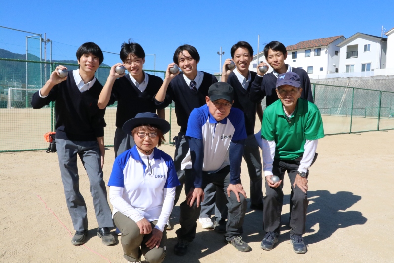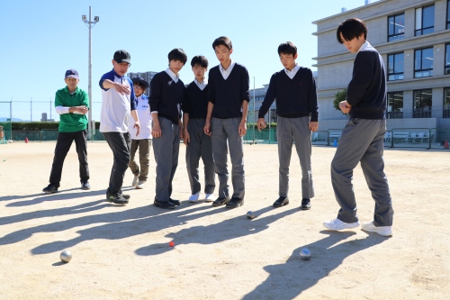 2年2学級のあるグループは「地域スポーツを通じた世代間交流の促進」をテーマに探究を進めており、生徒たち自身が広島市ペタンク協会の方へアポイントをとり、協会の方々を学校にお招きしてご指導いただきました。ペタンクは、フランス発祥のニュースポーツで、年齢や体力、国籍に関係なく誰もが楽しむことができる競技です。