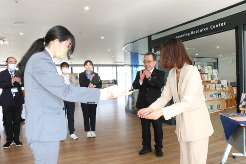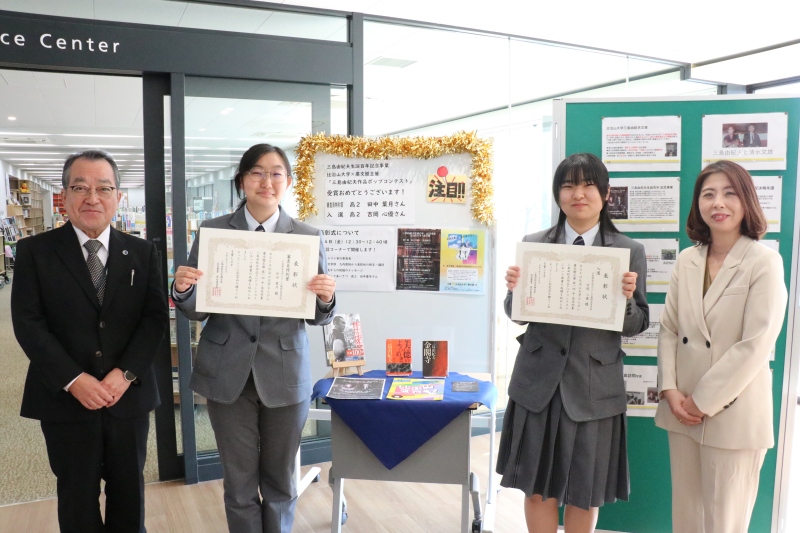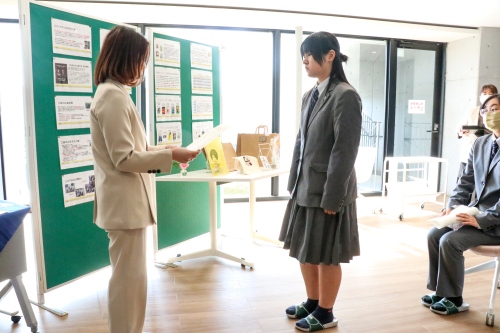 本日、コンテスト審査委員長であり三島文学を専門とされる、比治山大学文学部 九内 悠水子教授にご来校いただき、校内にて表彰式を行いました。