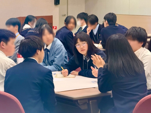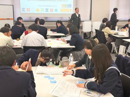 昼食後は、企業ごとのテーマ講演を聞き、いよいよ他校の生徒と混合チームを組んだグループディスカッションへ。