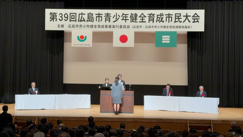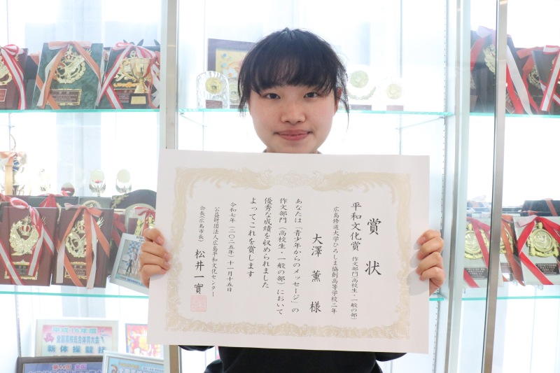 11月15日(土)に開催された「第39回広島市青少年健全育成市民大会」において、本校生徒の大澤薫さん(高校2年)が高校一般の部門で『平和文化賞』を受賞しました。授賞式では広島市副市長より賞を授与され、受賞作文を多くの来場者の前で発表しました。緊張しながらも堂々とした姿勢で発表し、会場から大きな拍手が送られました。