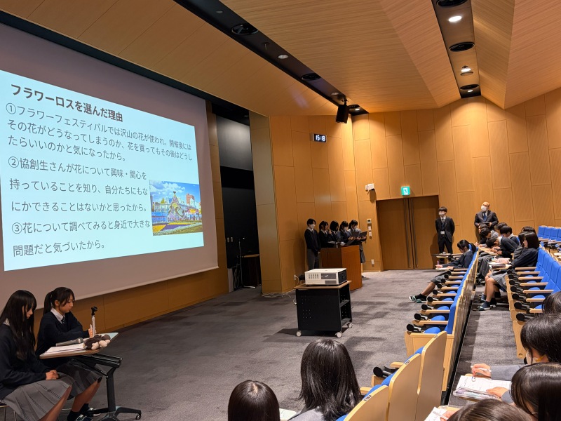 これらの発表に対して、奥田先生からは探究は客観的なデータに基づいて分析をすることが大切というアドバイス、白岩校長先生からは、先生からやらされるのではなく自ら動いて学ぶ「探究科」の意義についてお話がありました。