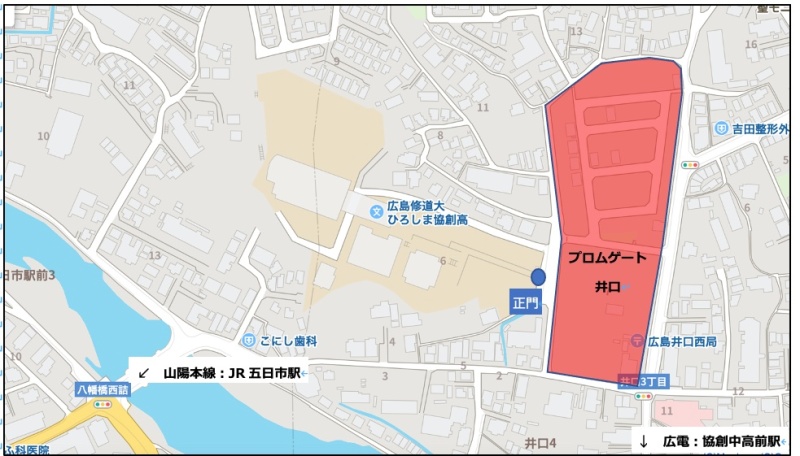 - 学校周辺での車の乗降、並びに送迎停車は近隣住民へのご迷惑となりますのでご遠慮ください。特に上図、赤枠域(プロムゲート井口内)への進入及び、赤枠周辺での乗降、送迎停車はご遠慮くださいますようお願いいたします。