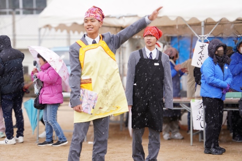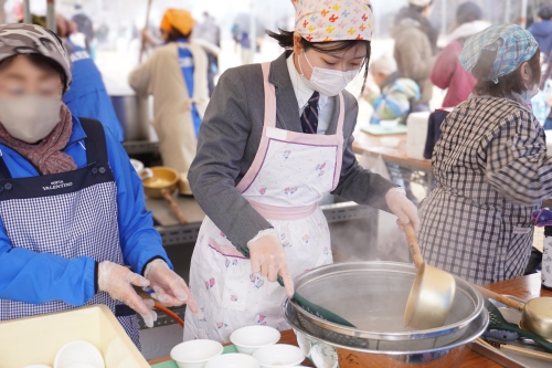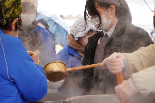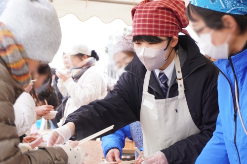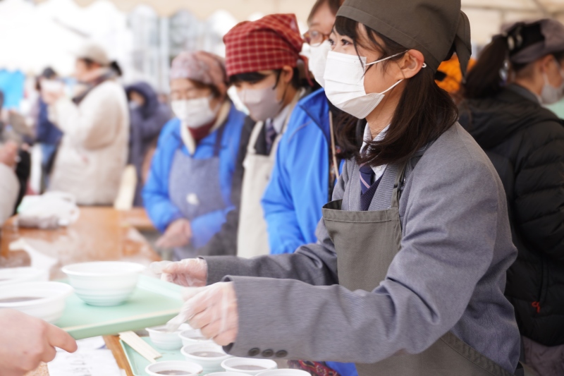 生徒たちは、「ぜんざい」の配布をお手伝いさせていただきました。 調理の補助から受付、行列の整理まで、凍える寒さの中でも生徒たちは終始笑顔を絶やさず対応。その明るい姿に、地域の方々からも「元気をもらえるね」と温かいお声をいただきました。