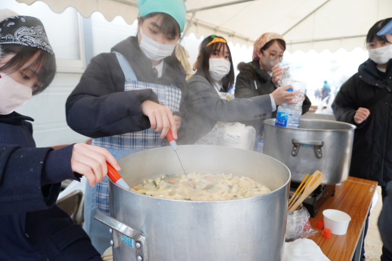 「一杯でお腹も心も満たされる」ことを目指し、具材にはにんじん、大根、ごぼう、ほうれん草、油揚げ、里芋など、地元の恵みをたっぷりと詰め込みました。 生徒たちにとって、これほど大人数の料理を一度に作るのは初めての経験です。事前の準備から当日のオペレーションまで、どうすれば手際よく熱々の状態で提供できるか試行錯誤を繰り返し、当日はチームワークを活かしてテキパキと動く姿が印象的でした。
