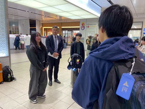 はじめに、高校教頭の藤島先生より、参加生徒5名とお見送りに来てくださった保護者の皆様へ、今回の留学に向けた心構えについてお話がありました。
