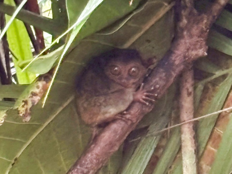 最初に訪れたのは BOHOL TARSIER です。タルシアは、日本語で「メガネザル」と呼ばれています。体長は約6〜8cm、目の大きさは約1.6cm、体重は約150gほどで、とても小さな動物です。赤ちゃんは親指ほどの大きさしかなく、とても驚きました。