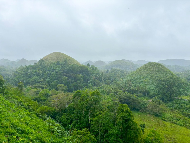 すべての丘はほぼ同じ形をしており、珊瑚礁由来の石灰岩でできています。なぜ同じ形になったのかは、今も解明されておらず、二人の巨人が石を投げ合ったという伝説もあります。この日は雨で霧が多かったですが、たくさんの緑色の丘を見ることができ、とても綺麗でした。