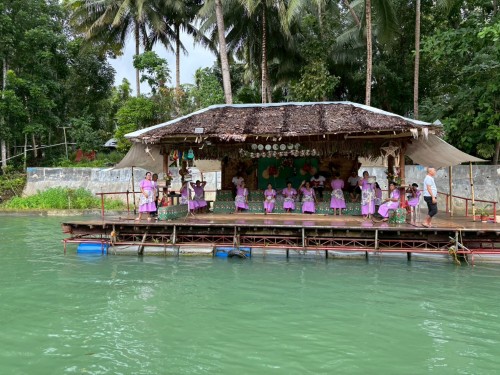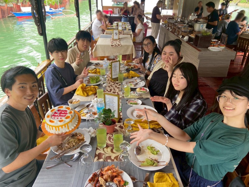 Loboc River では、船の上で昼食をとりました。景色を眺めながら食べるご飯は、とても美味しかったです。サプライズで森先生の誕生日ケーキも登場し、先生がとても嬉しそうだったのが印象的でした。また、フィリピンの伝統的なダンスであるバンブーダンスも見ることができ、とても面白かったです。