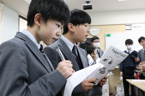 その中でも中学3年生の10月に実施する台湾への研修旅行に関連する取り組みは、その中核をなすものです。 研修旅行を実施する前は、その事前学習として個人で台湾に関することを調べ、その関心内容によってグループ分けをし、今度はそのグループで意見を集約しながら、グループとしての探究テーマを決定します。 その際は、必ず日本を始め、台湾以外の国や地域と比較しながら、その相違点などをあぶりだすことによって各グループでの課題設定を行います。