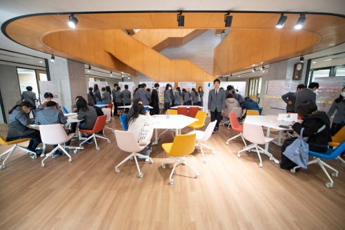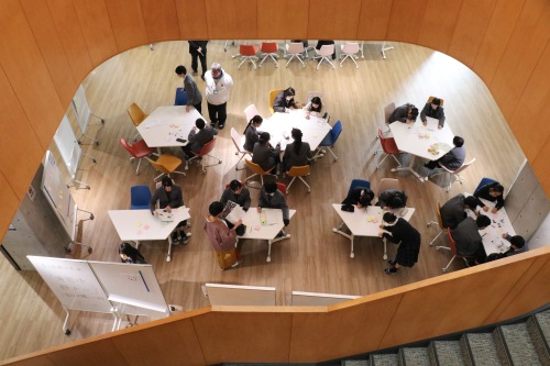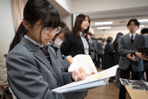 一方、オーディエンスには事前にピンクと黄色の2種類の付箋を配布し、聞きながら良かった点はピンク色の付箋に、アドバイスは黄色の付箋に書いてもらい、会場の外のスタディホールに設置した班ごとの模造紙に貼ってもらいます。それもあってか、1年生はみな真剣に3年生の発表に耳を傾けていました。後日、この付箋を参考にしながら、3年生は自分たちの取り組みを振り返るつもりです。 40分の設定時間の間、できるだけ多くの人に発表を聞いてもらおうと、3年生は発表が終わるとすぐに次のオーディエンスを集めていました。